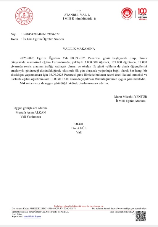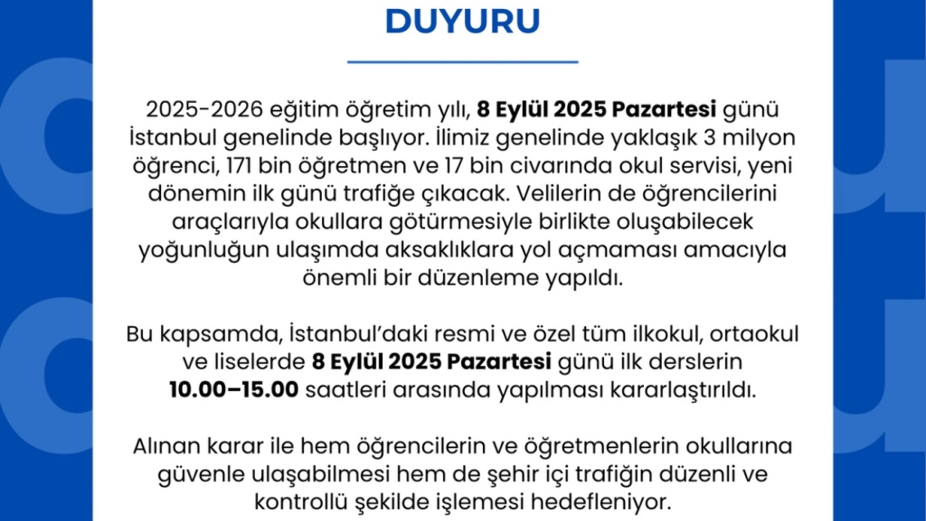 İstanbul Valiliği ve İl Millî Eğitim Müdürlüğü kararı doğrultusunda, okulların ilk günü trafik yoğunluğunu azaltmak amacıyla ilimizdeki tüm resmi ve özel ilkokul, ortaokul ve liselerde dersler 10.00–15.00 saatleri arasında yapılacaktır.